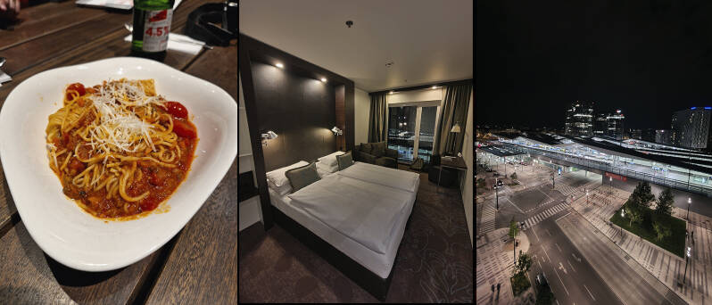 Po náročnom dni dobre padli pravé talianske spaghetti bolognese. Ďalšie prekvapenie ma ešte len čakalo. Ubytovanie s výhľadom na staničné námestie Wien hauptbahnhof. Bol som taký unavený, že som si to zabudol cvaknúť na foťák, tak mám len pár záberov na mobil. Dal som si sprchu a hajde spať. Čakal ma náročný predĺžený víkend (na piatok som si vzal dovolenku z práce). Ani tieto tri dni nestačili na spoznanie celého Semmeringu. Ráno som si nastavil budík na východ slnka, no senzácia sa nekonala pre ponuré počasie. Pospal som si teda ešte hodinku, a chystal sa na hlavnú stanicu. Mal som ju priam na skok, avšak hľadanie nástupíšť dá niekedy človeku zabrať. Redaktor Adrian to tu dobre pozná a o to ľahšie sa človeku cestuje. Ja som si ešte spravil "snapshot" nášho vlaku EC151 do stanice Semmering.